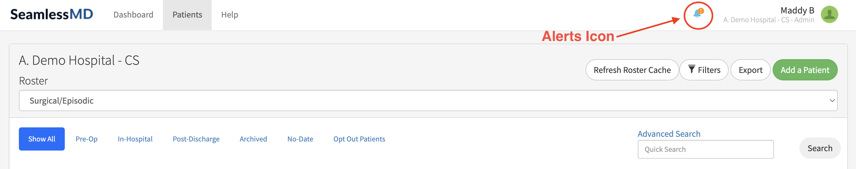 When you login to your account, you will be on the 'Patient' tab as shown at the top of your screen. You will see a bell icon in the top-right corner of your screen with an orange exclamation mark, which indicates that you have unread notifications pertaining to the alerts dashboard.