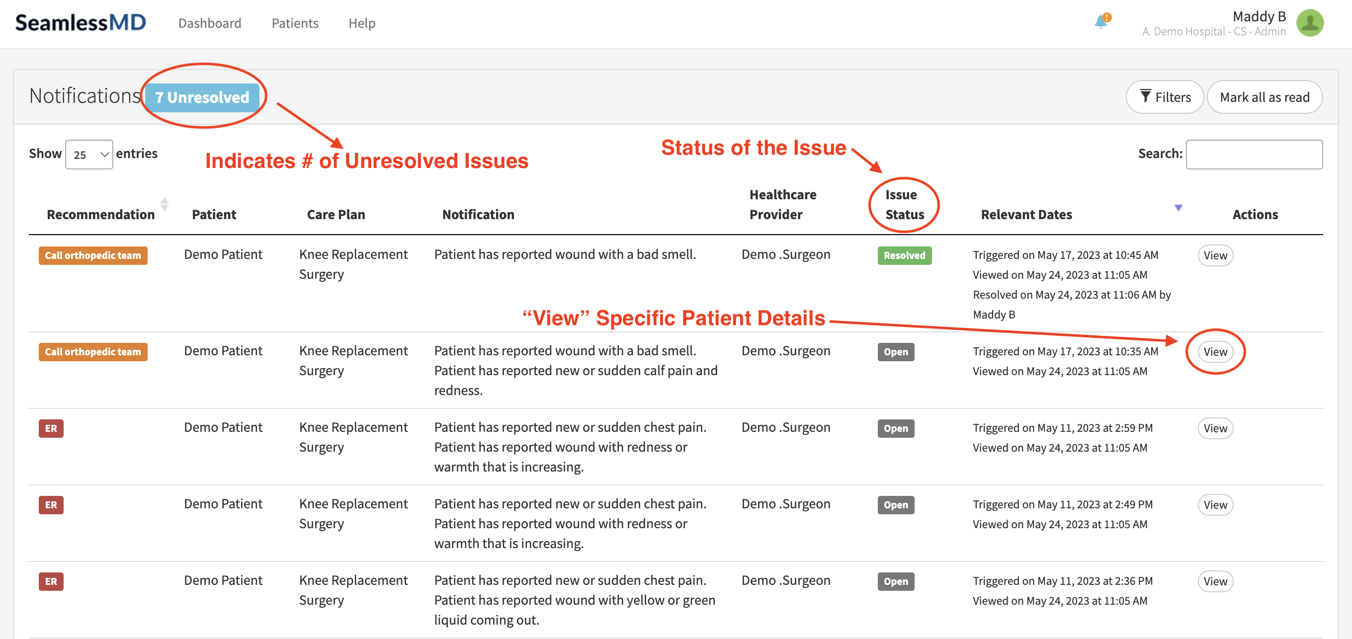 When you click on "View All Notifications", you will be taken to the alerts dashboard, where you will see even more detail on the notifications. The alerts dashboard will display a list of patients that notifications have been triggered for including what the notification is. Please note that there would be one notification per patient that may contain multiple issues. You will be able to see the status of the issue, which indicates if someone on your team has already addressed the alert. A timestamp of when the alert was first viewed is also shown.