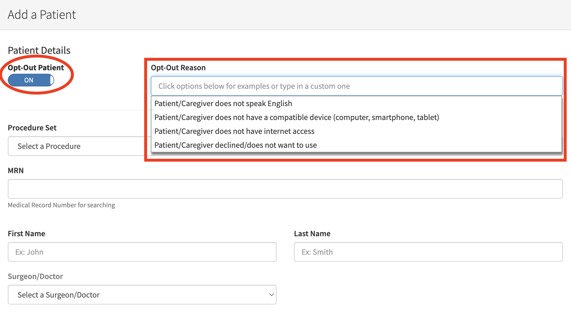 - Patient is no longer having surgery and surgery will not be rescheduled (opt out only in the event that the patient already has an existing account)