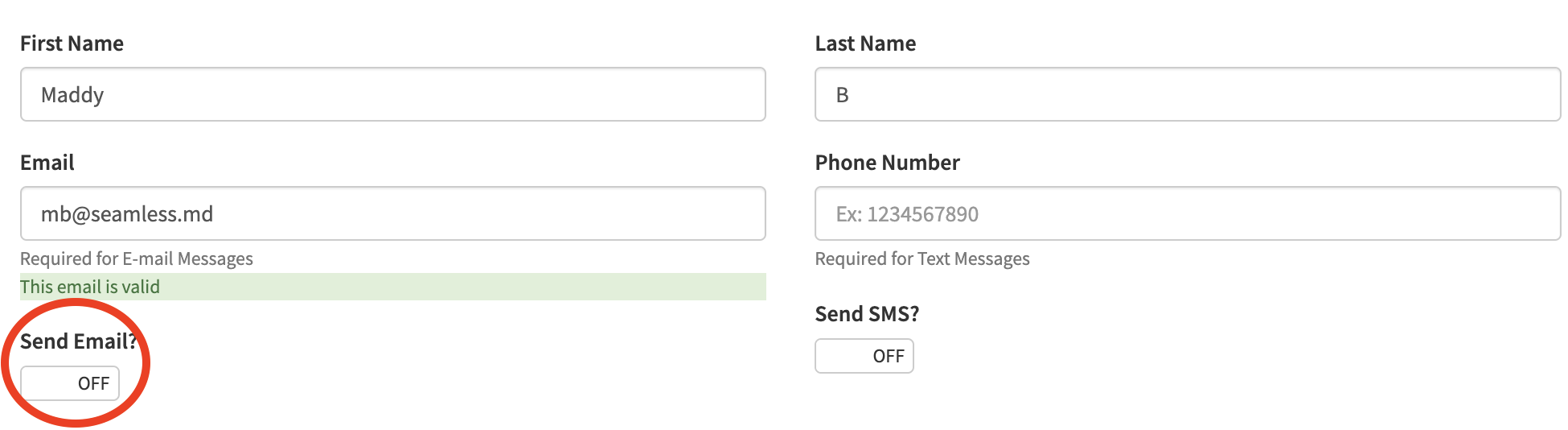 - Once the enrollment page opens, scroll to the contact information and ensure that the Send Emails and Send SMS toggles are turned off so that patients no longer receive notifications.