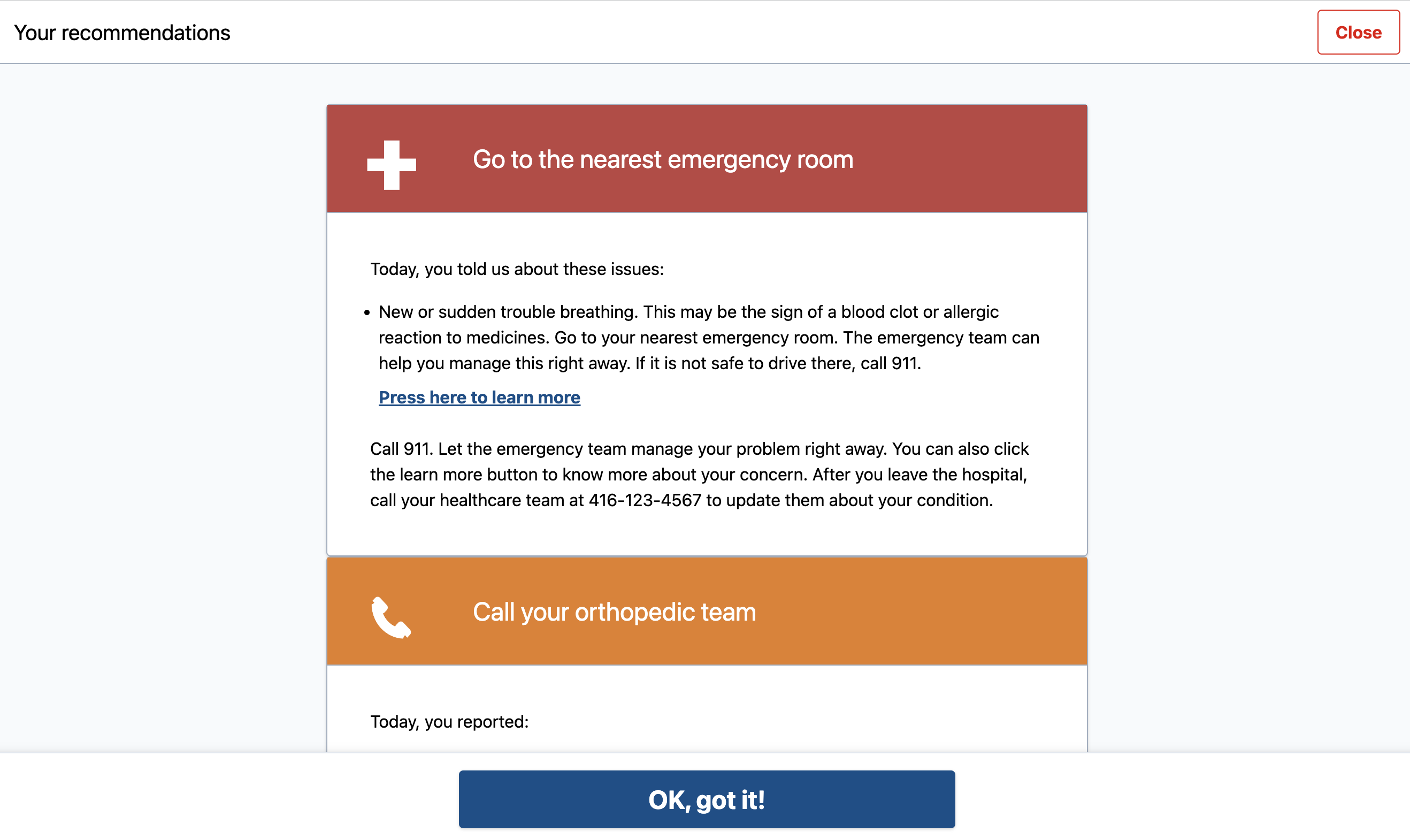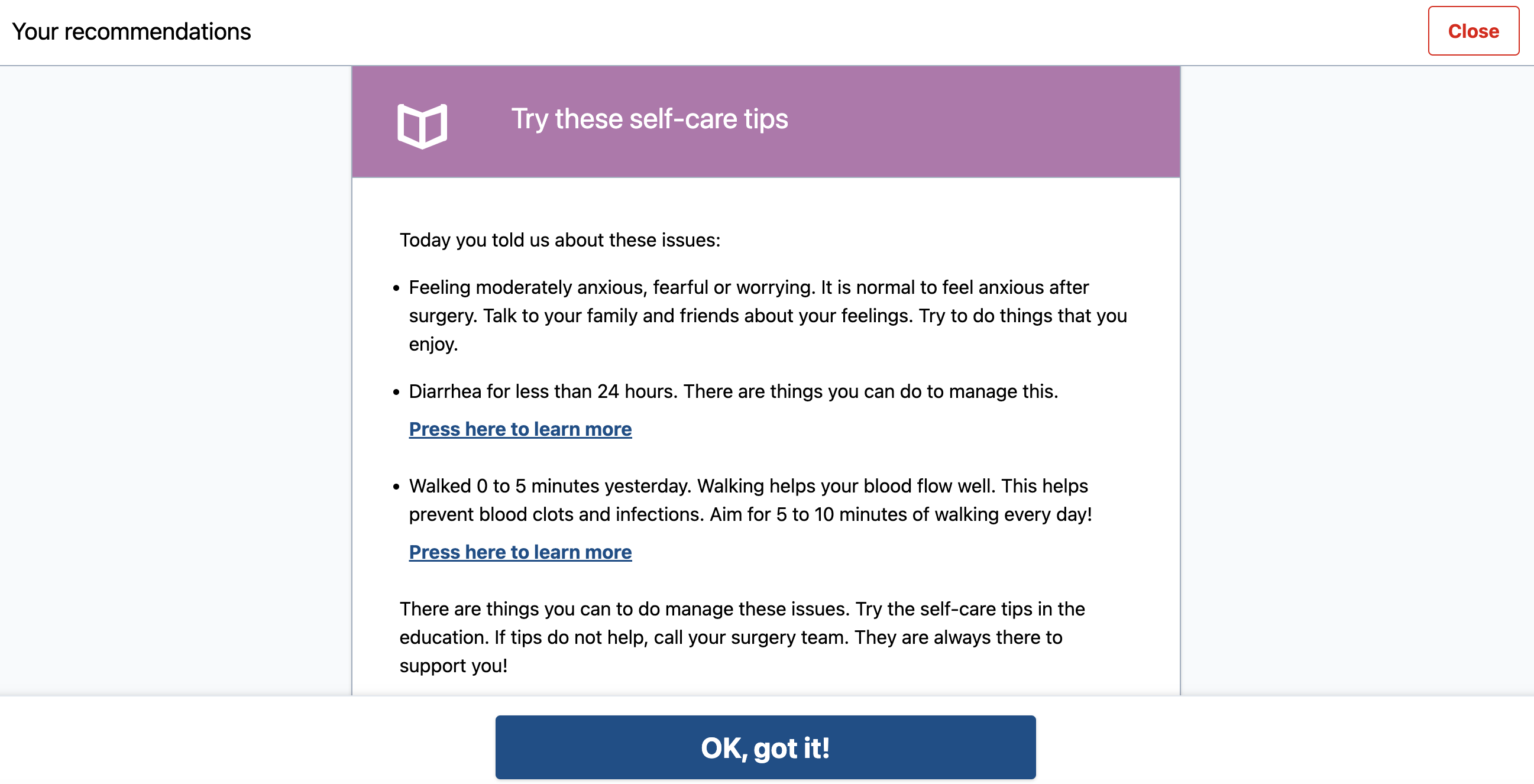 Depending on their answers, patients will receive recommendations such as "Try these self-care tips" and will be prompted to read about the issue they are reporting in the Library, or 'Call your healthcare team' or 'Go to the ER' if the survey responses are more severe
