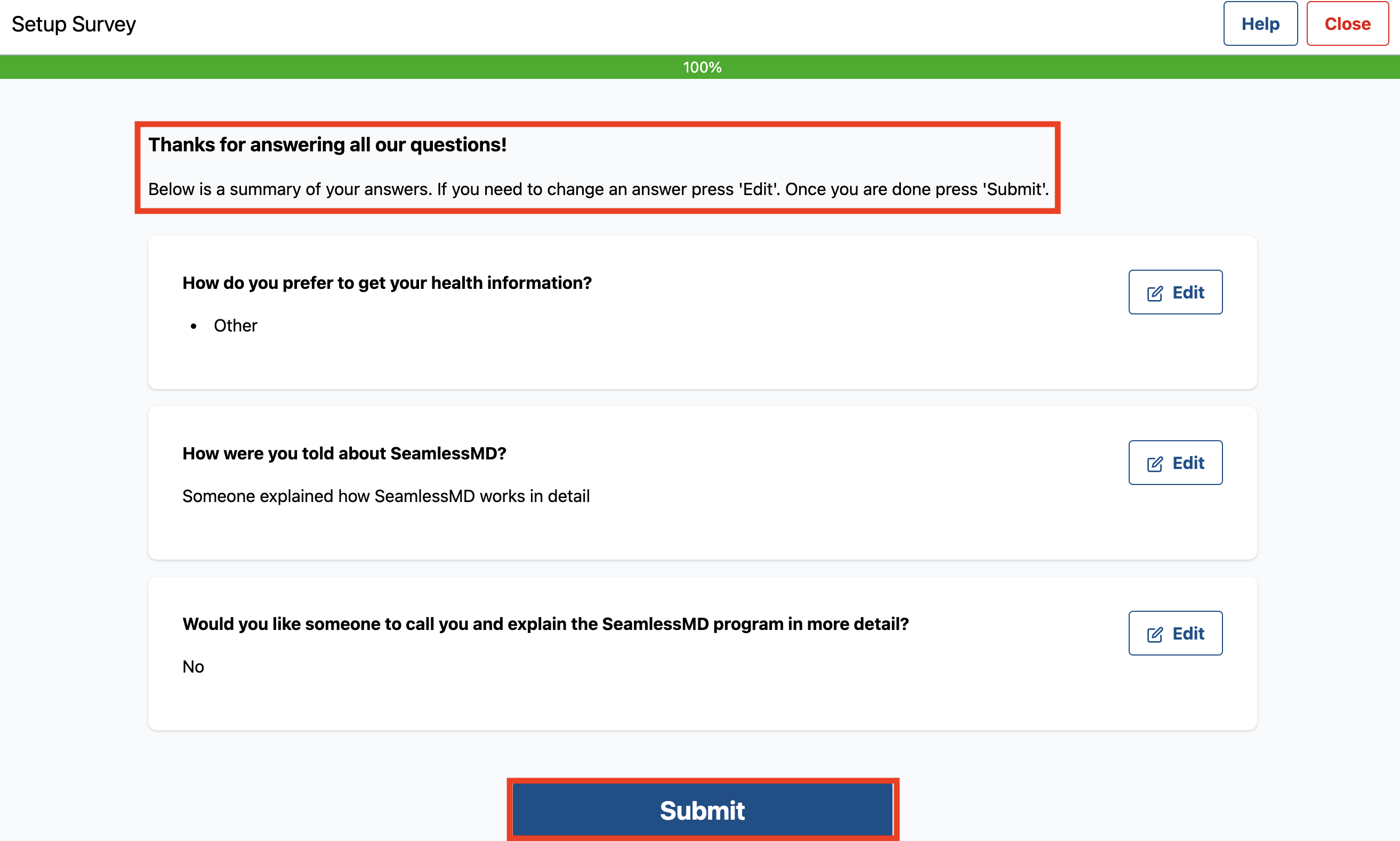 - After filling out a survey, patients will be brought to a summary page that allows patients to review and edit their answers prior to final submission. Patients will have to click on the 'Submit' button at the bottom of this page to ensure that their answers are submitted.