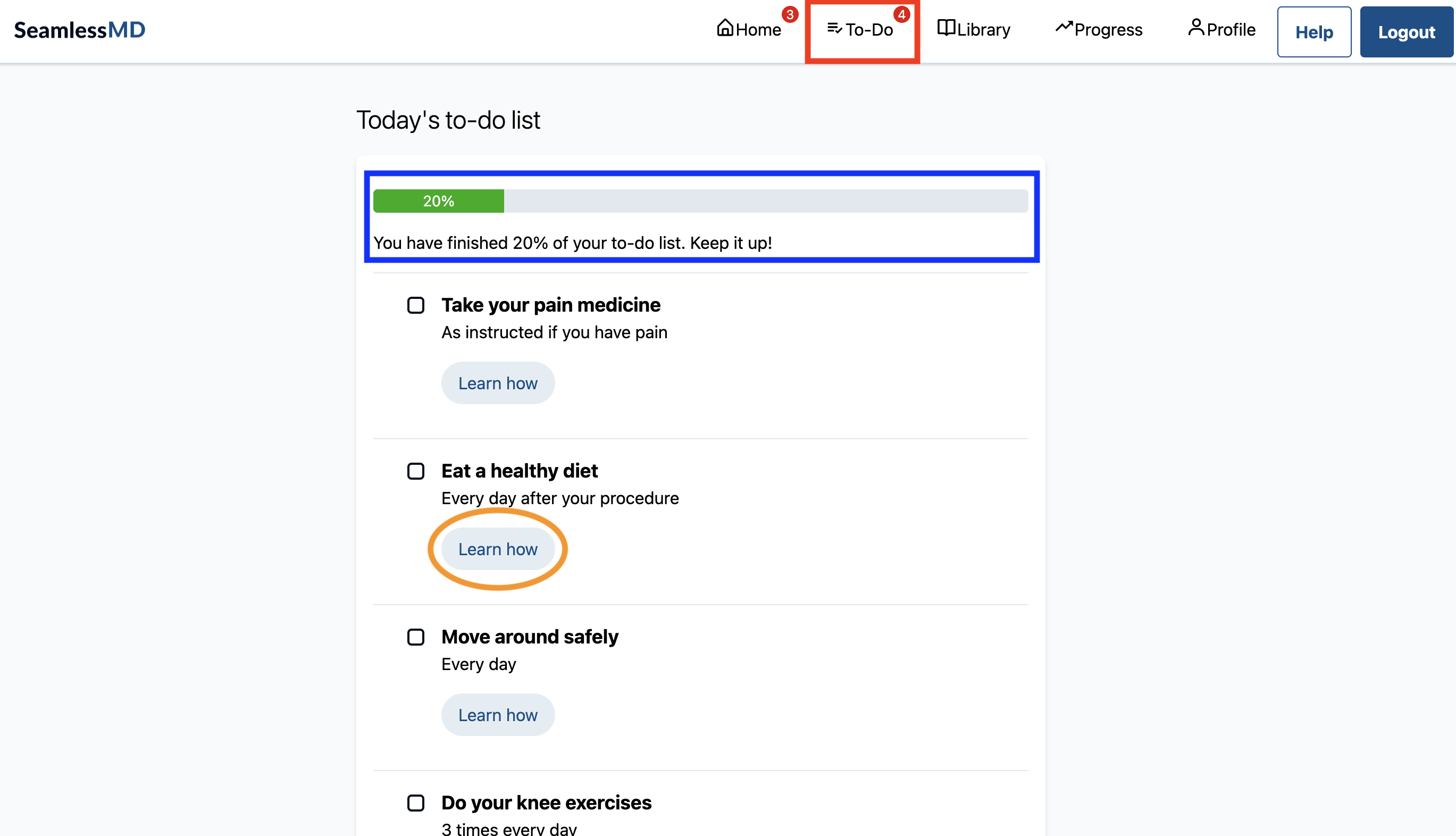 The To-Do list contains a list of tasks for patients to complete to keep them on track throughout their healthcare journey. They will be able to see a green bar that indicates what percentage of tasks they have completed. Patients can click on the 'Learn How', 'Learn Why', or 'Learn More' buttons associated with each of the tasks to learn more about the task. A pop up will appear with information pertaining to the tasks, which is also available within the Library.