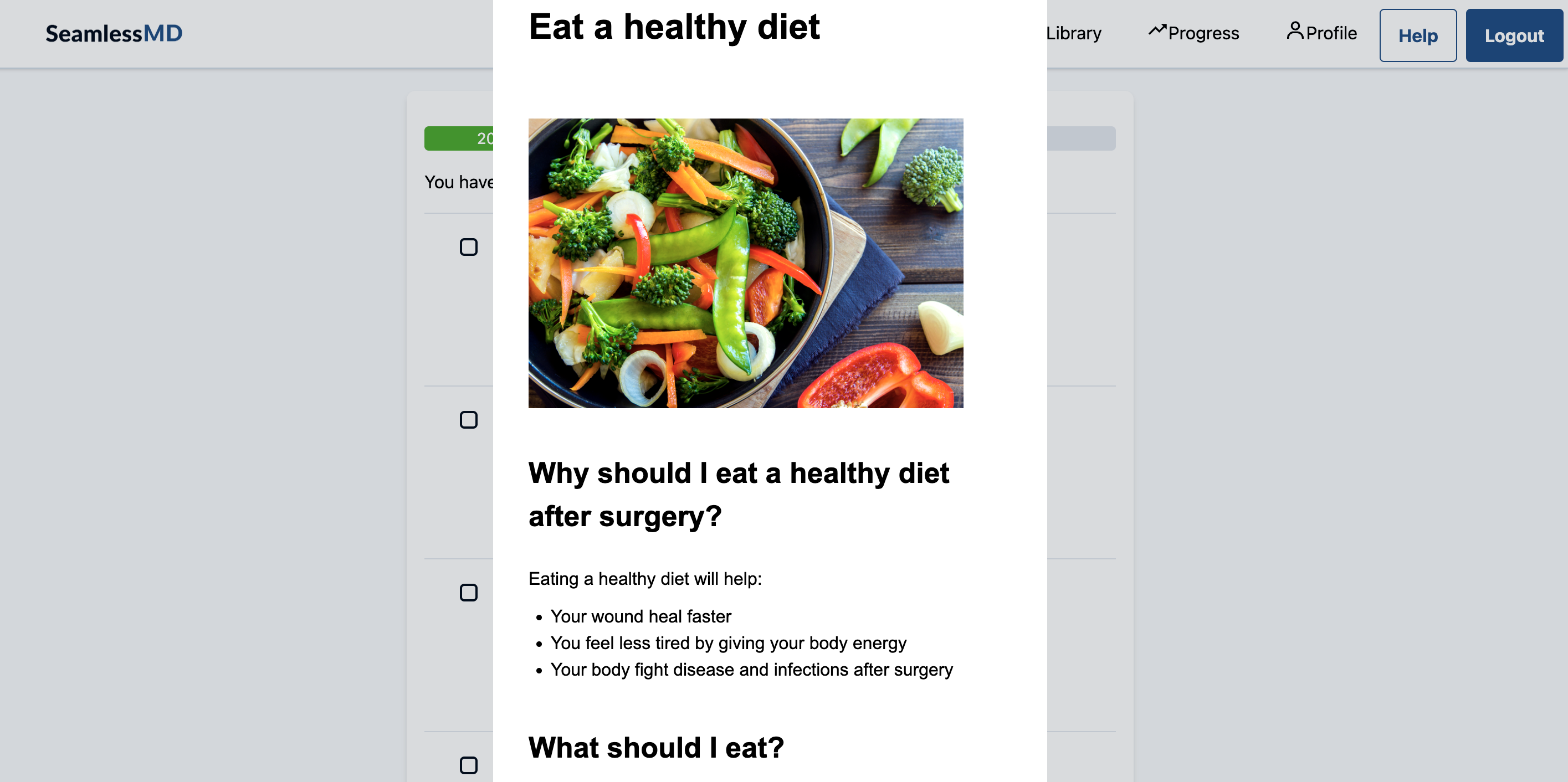 The SeamlessMD program supports patients before, during and/or after their procedure or across their healthcare journeys using evidence-based education, tasks to keep them on track, and daily health check surveys to track their symptoms and recovery milestones. This article will outline what the SeamlessMD patient experience looks like.