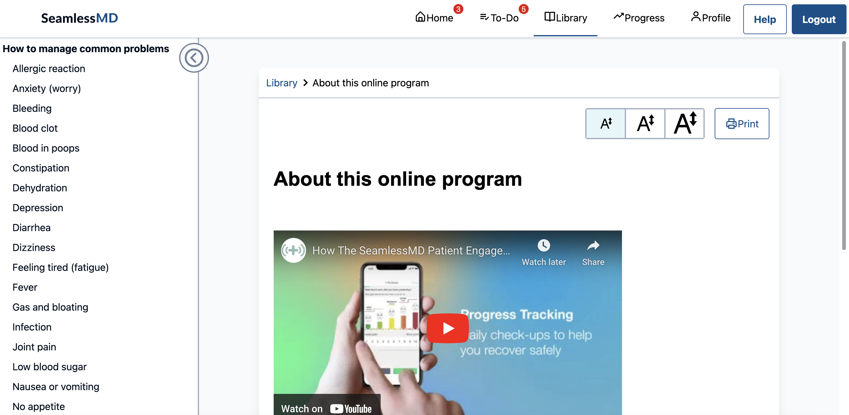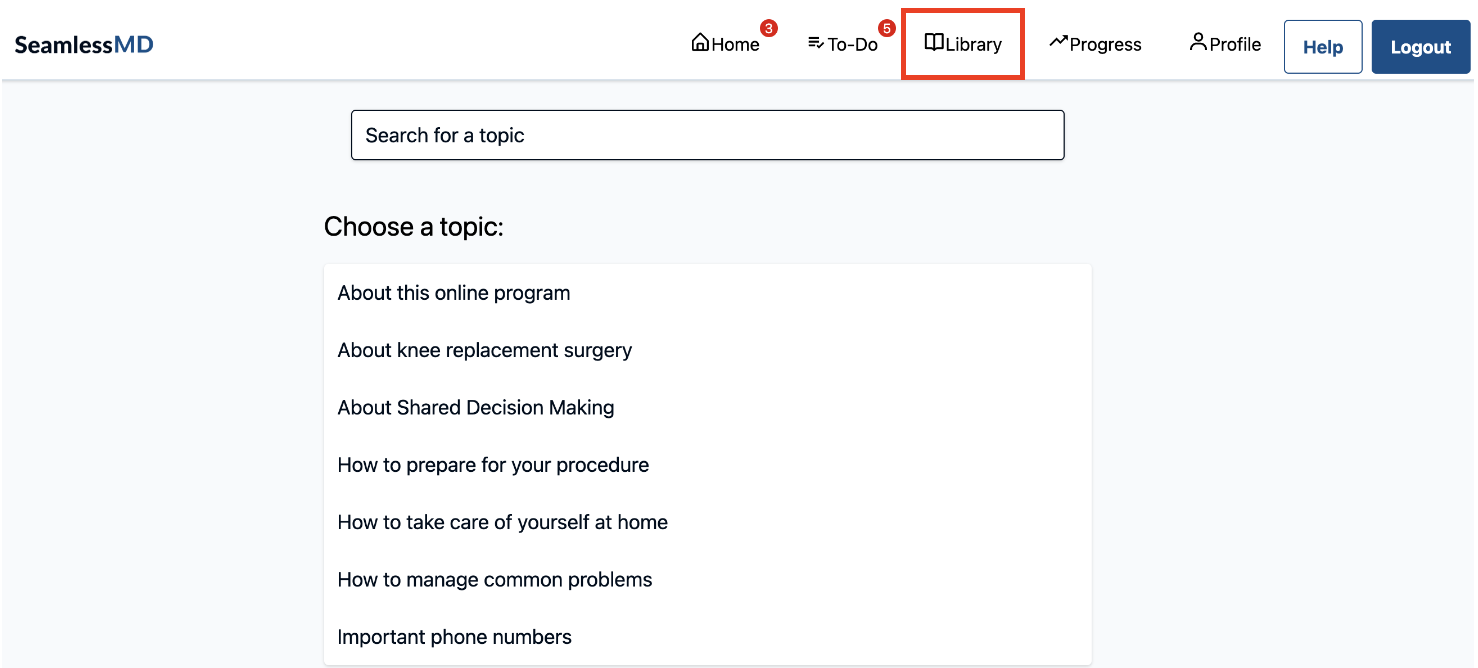 Patients will be able to use the 'Search for a topic' function in the Library to find content within their account. Once they search for a topic, all content within the program will appear in a menu on the left side of their program so they can read through all information within the program from pre-op to post-op.