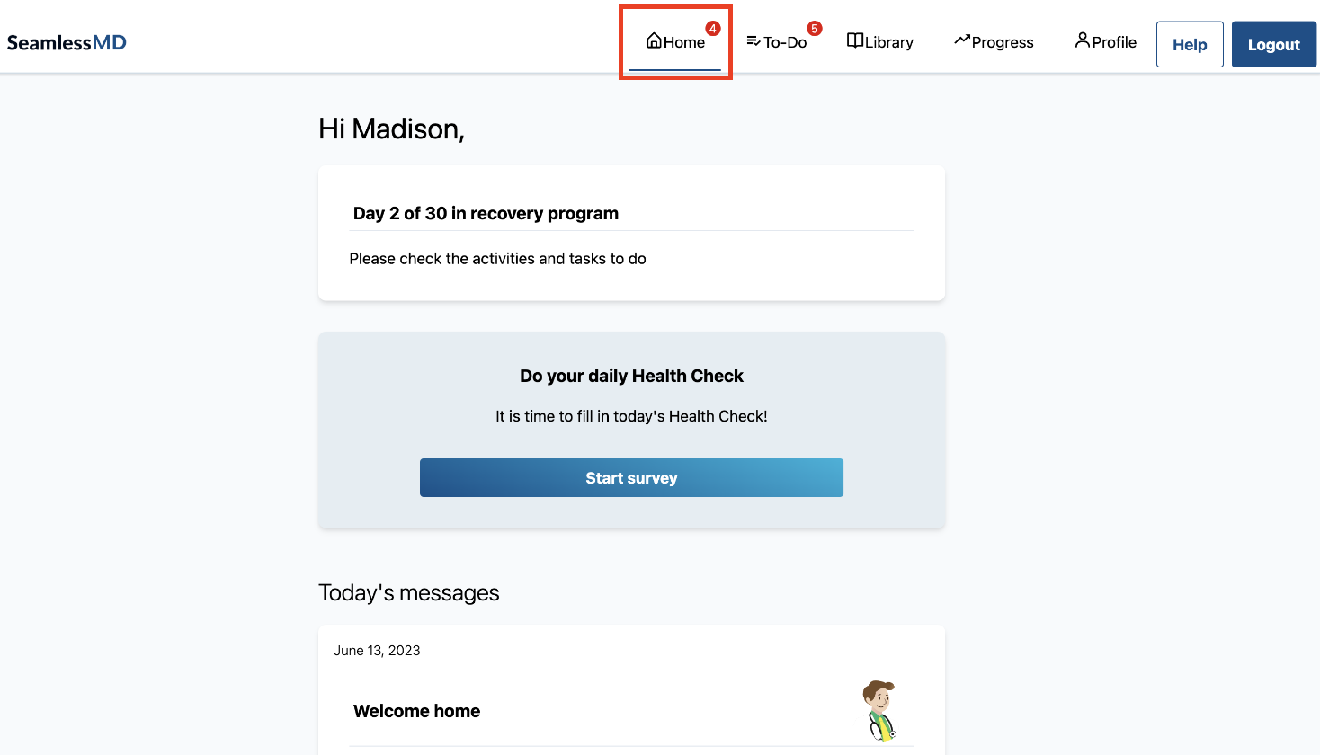 When patients log on to their account, they will see a Home Page with reminders. They will also have access to a To Do list tab with tasks to keep them on track throughout their healthcare journey, a Library of educational information to read about their procedure and recovery, as well as surveys.