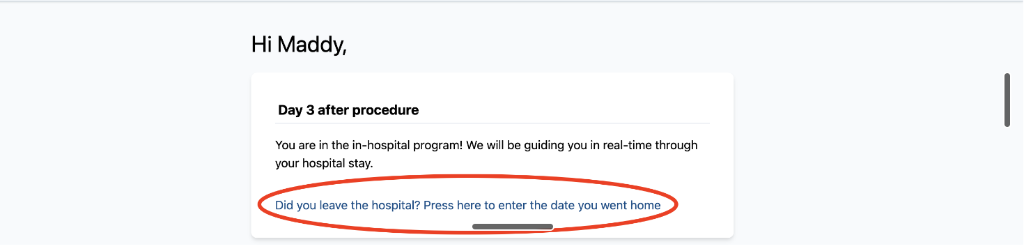 Once their procedure has occurred and they are discharged from the hospital, patients will be prompted to enter their discharge date on the Home Page of the program by clicking the 'Did you leave the hospital?' link.
