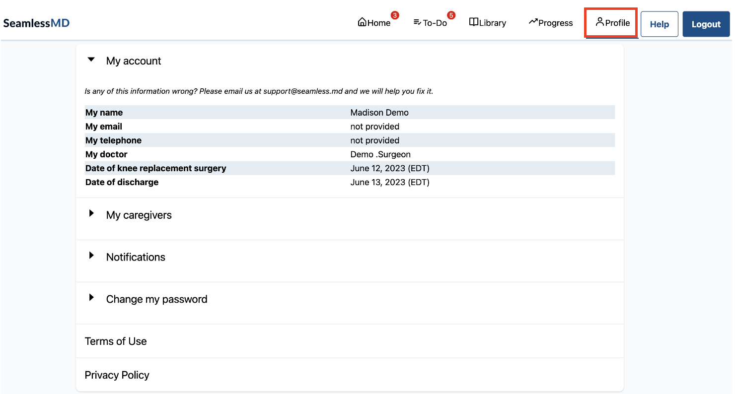 The Profile tab is where patients can go to review their account information. If patients want to change information within their account, they should be directed to contact support@seamless.md.