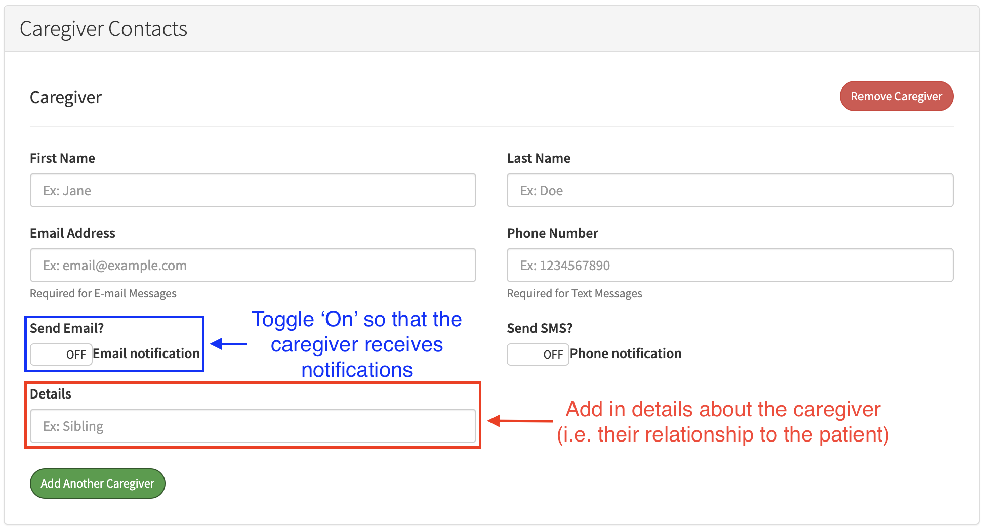 Caregiver(s) and their information can be added upon enrollment. You will be able to turn notifications on and off and add details about the caregiver (i.e. the relationship to the patient).