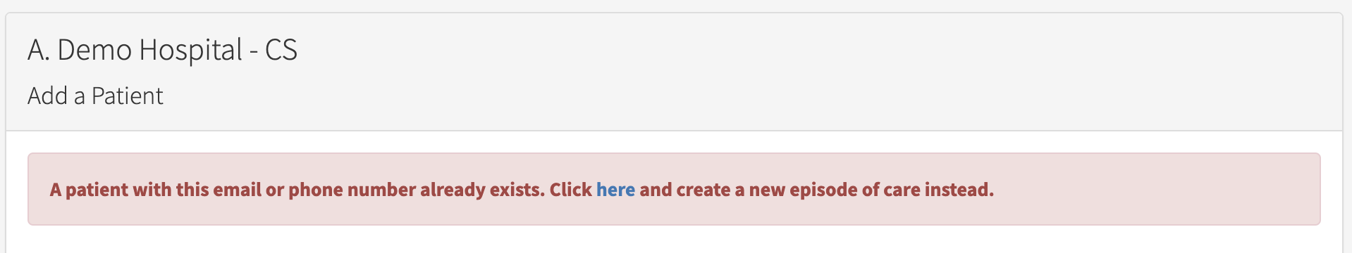 If you receive an error message that contact information already exists within an account when you are enrolling a patient, it means that the phone number or email address you have entered is already in use. This could be because the email address or phone number is being used in an existing account for the patient or because two separate patients share the email address and/or phone number.