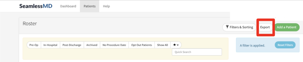 - From the Patient Roster, click “Export” (top right corner).