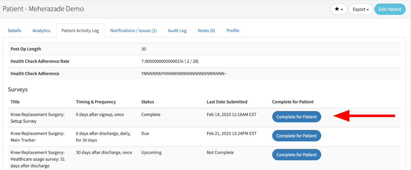 - Under the “Surveys” section, click the blue “Complete for Patient” button next to the survey you would like to complete.