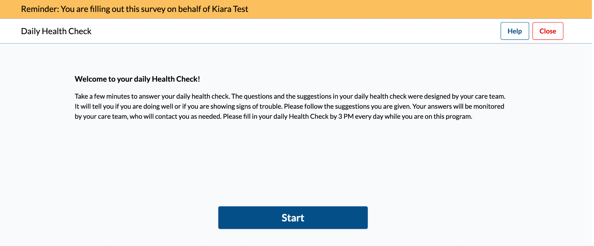 In the SeamlessMD clinical application, select clinical users can complete surveys on behalf of the patient. This increases the adherence and response rate for surveys, by enabling clinicians to complete surveys for patients that are unable to do so themselves (e.g. over the phone).