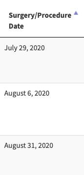 To sort the columns in ascending or descending order, click the column title on the patient roster. In this example, “Surgery/Procedure Date” was clicked to sort the patients into ascending order, which is indicated by the blue arrow to the right of the column title.