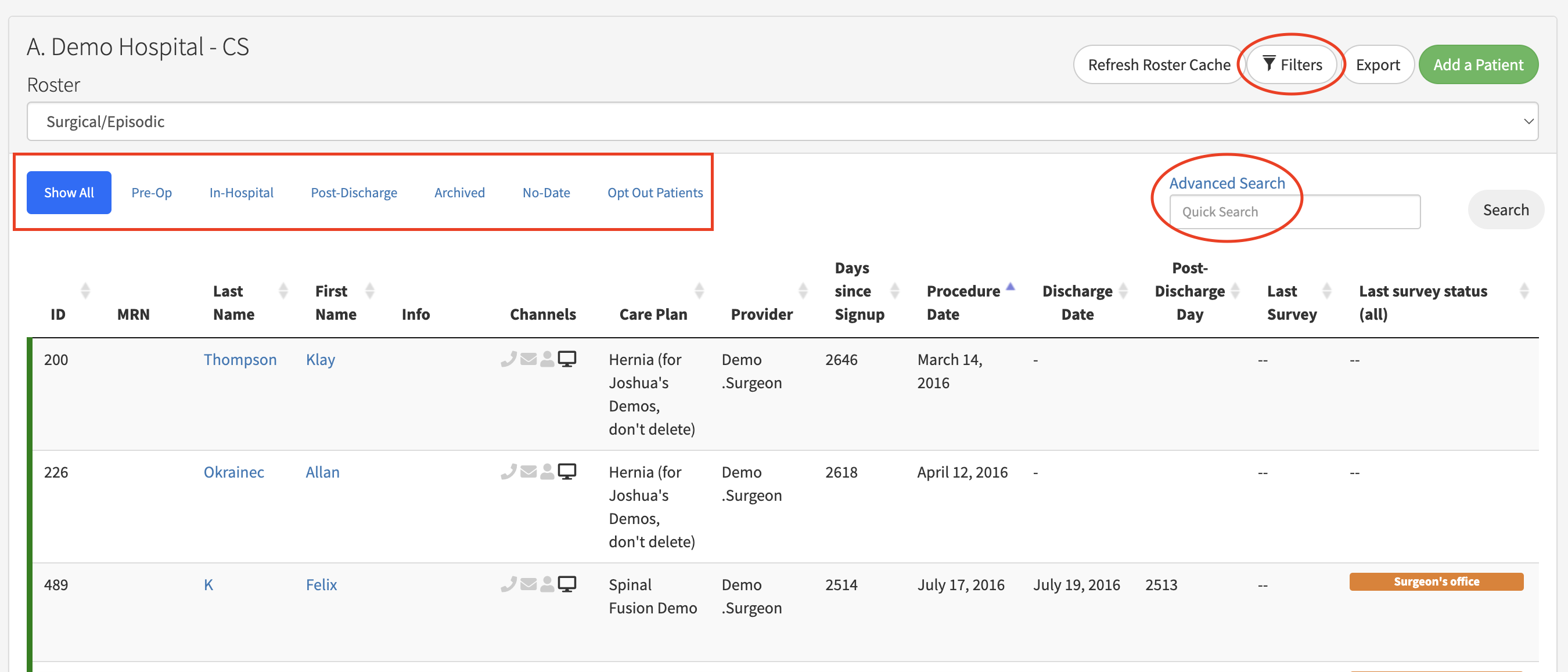 Note: these are the quick filters on the surgical roster. Other rosters, such as the chronic roster, may have different preset options.